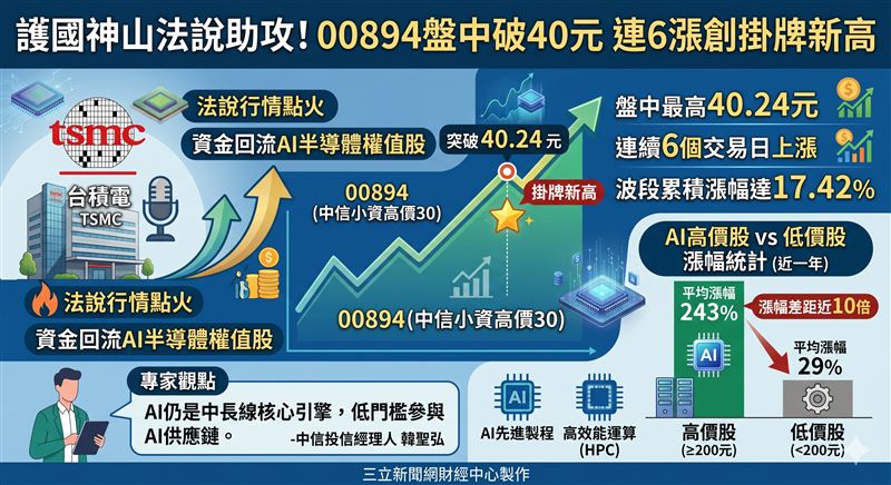 台股多頭氣勢如虹!受惠於台積電法說會行情提前點火,加上美伊地緣政治風險逐步鈍化,資金積極回流AI半導體權值股。台股大盤今(15)日不僅收復3月失土,更一舉刷新歷史新高紀錄。在強勁買盤推動下,聚焦AI高價股的科技市值型ETF:中信小資高價30(00894)表現尤為亮眼,盤中股價一度衝破40元大關,同步改寫掛牌以來新高。