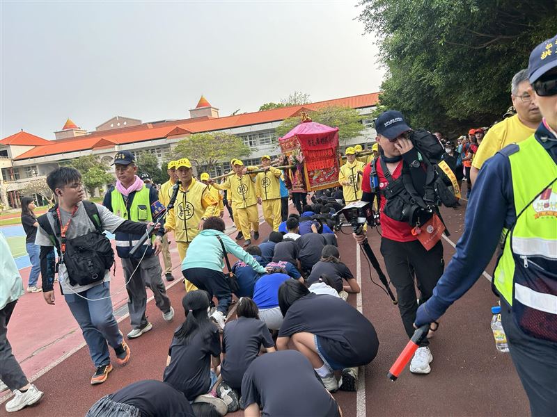 據了解,今天清晨,白沙屯媽祖鑾駕從大村鄉起轎,沿著台1線一路徒步南下,預計中午抵達雲林縣西螺鎮。不過途中經過田尾國小,師生們一大早就在門口等待,高舉牌子熱情大喊「媽祖我愛您」,彷彿聽見孩子們純真的呼喚,讓「粉紅超跑」特地轉向進入校園,讓學生們又驚又喜,紛紛跪在操場上鑽轎腳。