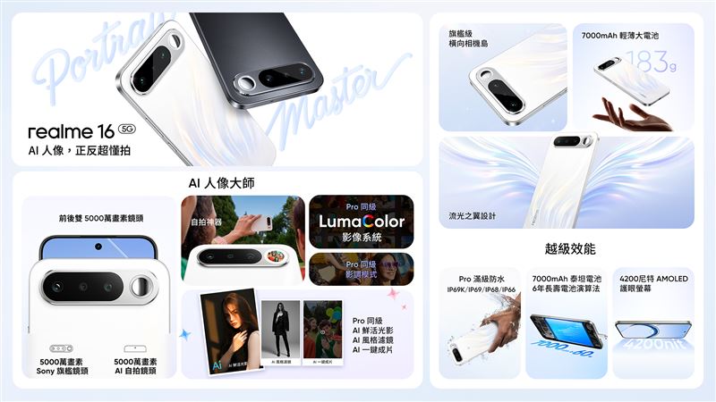 realme 16 5G 以後置「補光自拍鏡」打造更直覺的自拍體驗外,同步導入與 Pro 級 LumaColor 影像系統,透過全維膚色感知優化、光學景深融合虛化、人景光影重構等技術,實現更接近人眼所見的精準色彩與自然膚色呈現,並進一步強化光影層次與氛圍塑造,帶來更具沉浸感的人像拍攝體驗。