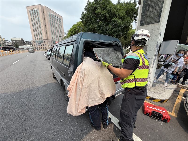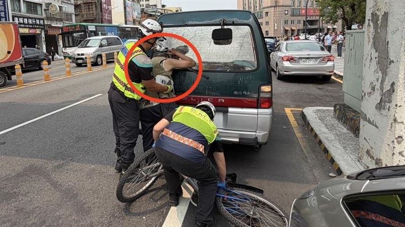 今日中午12時32分許,男子騎腳踏車沿著中山路二段行駛,經過中山路二段天橋下時,因不明原因猛力追撞上停放在路邊的廂型車,男子頭部甚至撞破後擋風玻璃,整顆頭鑲嵌進去,驚悚畫面嚇壞路過民眾。