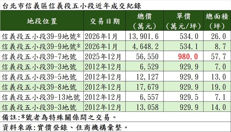 大家房屋企劃研究室公關襄理賴志昶表示,該地現況為停車場,過去曾為菜園與運動品牌球場。2012年該街廓曾以單價近930萬元創下紀錄,高懸多年後,如今由39-7地號以980萬元單價再創信義區土地成交單價的新天花板。