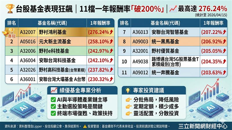 根據最新基金數據,台股基金在過去一年展現出驚人的獲利能力。統計至215日,市場上共有11檔台股基金的一年報酬率突破了200%,最高更達到了276.24%。這場由科技股主導的盛宴,讓投資者大呼過癮。