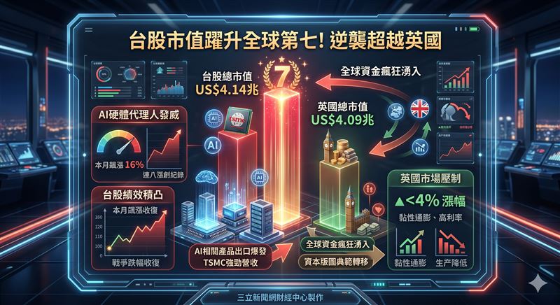 匯豐(HSBC)與美銀(BofA)調查顯示,雖然英國股市在商品價格波動中具備防禦價值,但目前全球投資人對英股仍多維持減持部位。反觀台灣,隨著AI基礎設施需求進入長期循環,台股正脫離傳統新興市場的範疇。分析師認為,市值超越英國不僅是數字上的勝利,更象徵著全球投資權重的典範轉移,台灣已成為全球資本在AI時代不可或缺的配置重鎮。