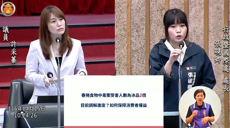 議員許采蓁15日在議會質詢時表示,先前冰品中毒案和這次春捲中毒案都在自己選區,相當重視;冰品受害者超過百人,業者事後極有誠意、還賣了房子賠償損失,最後全部順利達成和解;但他注意到這次春捲中毒案受害者是冰品案的兩倍,詢問市府目前賠償協調進度如何?若須進入團體訴訟,有無輔導機制?