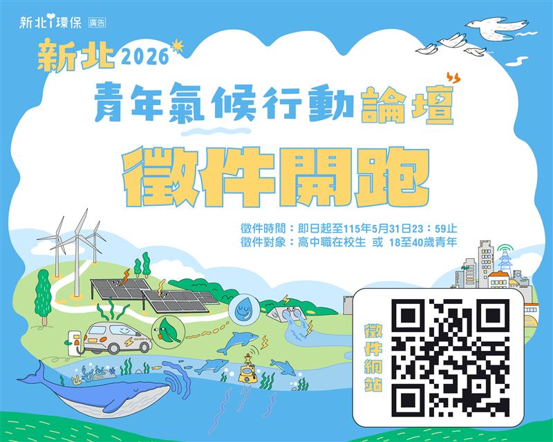 為鼓勵青年關注氣候議題並投入轉型力量,新北市環保局預定於今(115)年10月舉辦「新北2026國際青年氣候行動論壇」,即日起正式啟動「青年氣候行動徵件」活動,本次徵件主題涵蓋「能源設計」、「循環經濟」、「生態環境」及「群眾溝通」四大面向,邀請全國高中職學生及18至40歲青年組隊提案,將創意轉化為實際的氣候解方。