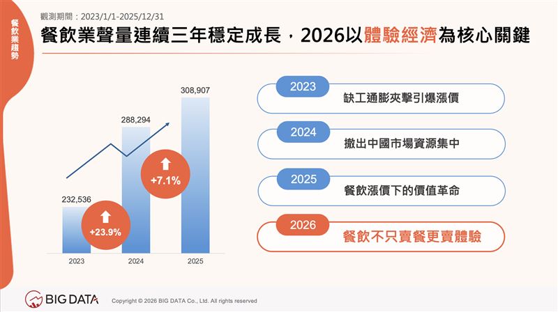 大數據(股)公司發布《2026 餐飲食代轉型:「心」體驗成王道,打造品牌 AI 升級引擎》洞察報告,透過《KEYPO大數據關鍵引擎》輿情分析軟體觀察發現,台灣餐飲業網路聲量連續三年穩定成長, 2025 年全年總聲量達 308,907 筆,較 2023 年的 232,536 筆累計成長32.8%。整體市場可明顯劃分為三個階段, 1–4 月全面漲價潮席捲各大品牌,消費者對「外食變貴」的感受極為強烈; 5–8 月進入品牌重整期,各集團重新聚焦核心品牌,淘汰低效據點;9–12 月則迎來多角化與跨界聯名浪潮,為市場注入新活力。
