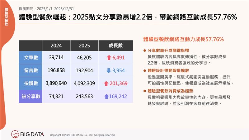 大數據(股)公司指出,餐飲競爭的核心已從「廚房裡的成本戰」全面轉向「餐桌上的體驗戰」。體驗型餐飲貼文的被分享數較前一年暴增 2.2 倍,IP 聯名活動相關聲量更成長近 95.47%,清楚說明消費者願意為「好拍、好玩、有故事」的用餐體驗買單,「吃什麼」已是基本門票,「怎麼體驗」才是品牌溢價的真正關鍵。