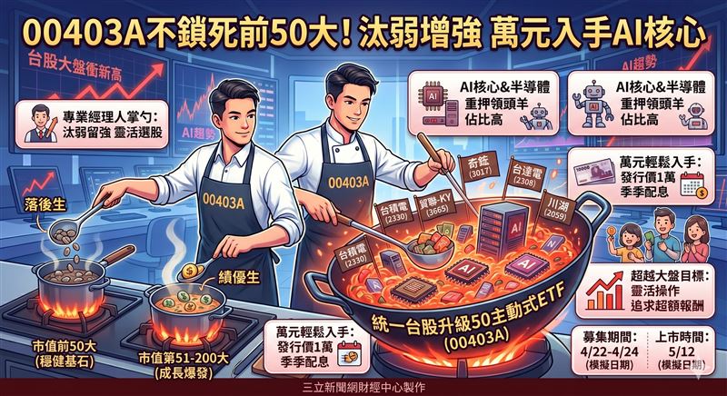統一投信投研部副總經理尤文毅對後市極具信心,他認為在AI趨勢與資金面簇擁下,台股行情「不太會休息」。為了讓小資族也能輕鬆參與這波長線複利行情,00403A每張發行價定為1萬元,並採季配息機制,預計5月12日正式掛牌。