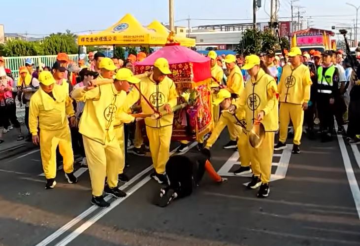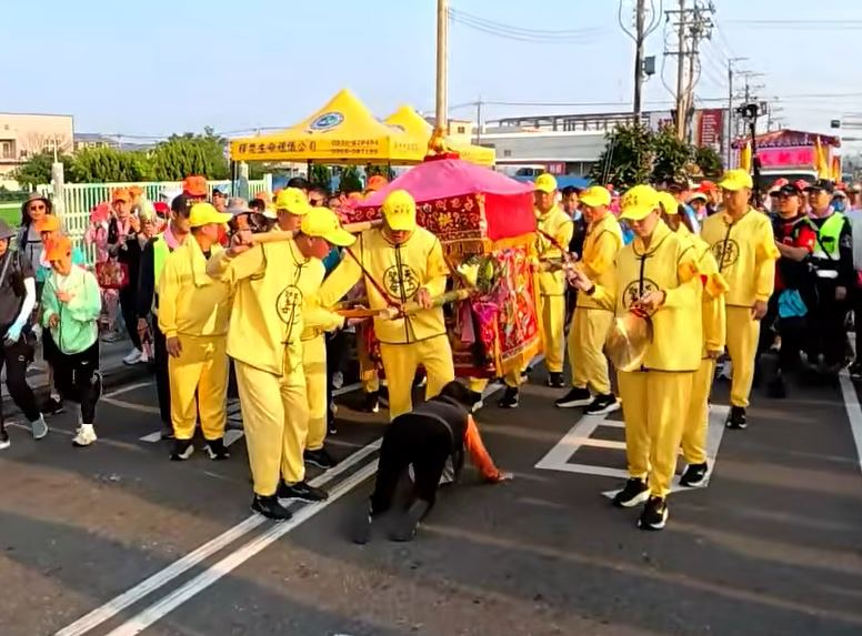 白沙屯媽祖進香14日走到台中、彰化一帶時,看到沿途有不少信眾遵循轎班人員指示,紛紛跪在路上等待鑽轎底。不過突然有一名穿著橘色上衣、深色背心的阿婆衝到粉紅超跑前面跪下,堅持從鑾轎下方爬過。