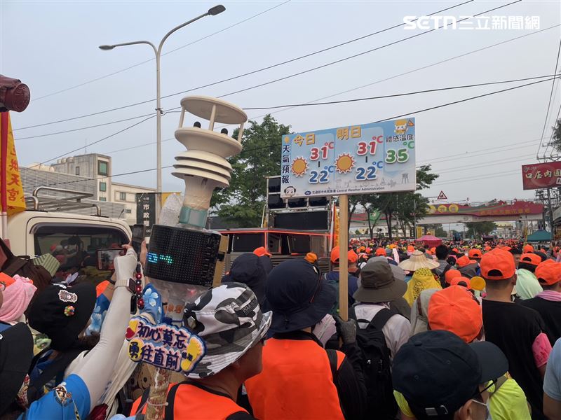 中央氣象署今年首度投入「行動氣象儀」陪同香燈腳們前行,隨香燈腳參與白沙屯媽祖進香,沿路上引發不少民眾關注。「氣象君」受訪表示,路上約每一小時就有約10組民眾與他們互動及拍照,原本儀器約8公斤重,但沿途信眾贈送結緣品,使重量逐漸增加。形容「一路走下來,裝備就像聖誕樹一樣掛滿祝福」。