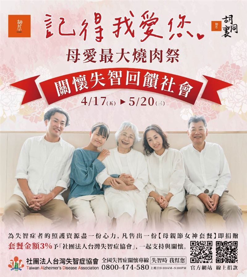 根據衛生福利部調查發現,目前全台65歲以上失智症人數已超過30萬人,平均每13位就有1位失智。為了讓社會大眾對於失智症者的照護資源有更多關懷與支持,今年母親節自4月17日至5月20日期間,胡同燒肉、胡同裏燒肉攜手「社團法人台灣失智症協會」,發起【記得我愛您.母愛最大燒肉祭】公益捐贈活動,點購《母親節女神套餐》,業者將捐贈套餐銷售金額3%予「台灣失智症協會」,期盼透過大眾的支持,讓更多家庭在面對挑戰時,不再孤單。