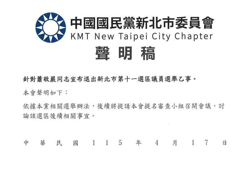 面對突如其來的退選風暴,國民黨新北市黨部稍早也火速發出聲明回應。市黨部表示,針對蕭敬嚴同志宣布退選一事,後續將依照黨內的相關選舉辦法,提請「提名審查小組」召開會議,針對該選區的後續提名作業進行討論。