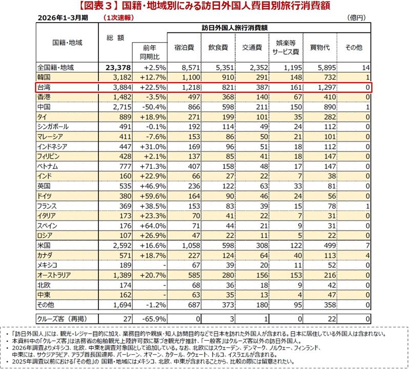 日本觀光廳報告指出,2026 年第一季外國遊客在日本的總消費金額達到 2 兆 3,378 億日圓,展現出後疫情時代觀光復甦的強勁動能。其中,台灣以 3,884 億日圓(約新台幣 815 億元)的總消費額位居各國之首,較去年同期顯著成長 22.5%。