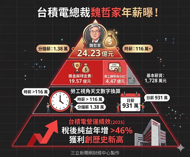 根據文件細項拆解,魏哲家的薪資結構主要由四大部分組成。基本薪資約1,728萬元,僅佔總酬金不到1%。真正拉高天花板的是「獎金與特支費」,金額高達19.57億元,加上「員工酬勞與分紅」約4.47億元。受惠於AI需求強勁,台積電2025年獲利創下歷史新高,稅後純益年增逾46%,也讓魏哲家的績效獎金直接領到頂,總額精確數字為24.2269億元。