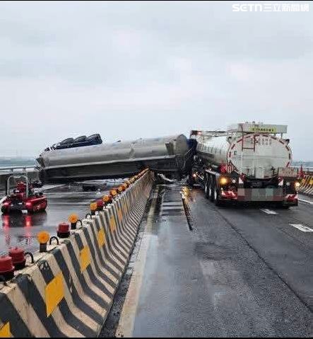 台61線北上161公里中彰大橋路段發生重大車禍,今日(17日)凌晨2時許,一輛曳引車因不明原因撞破紐澤西護欄衝入南下車道,導致1輛槽車與1輛小貨車因閃避不及翻覆,並波及另外3輛自小客車,釀6車連環撞,釀3人受傷送醫,目前警消正在排除路況。