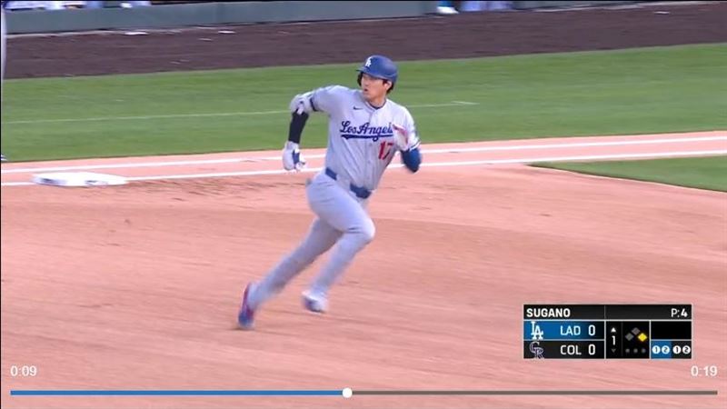 菅野智之全場第1球讓大谷翔平揮空,接著在2好1壞球數領先投1顆內角滑球,這球不打應該是壞球,但大谷出棒打過一壘手頭頂形成安打,儘管洛磯右外野手很快撿起球回傳,大谷翔平還是先一步滑上二壘,用「首局首打席」二壘安打延續連續上壘場次到49場。