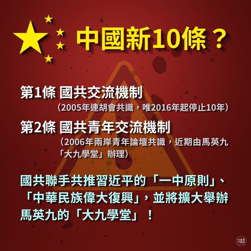 近期國民黨大動作宣傳中國在「習鄭會」後釋出的所謂「新涉台10條」,不斷將其包裝為「重大利多」與「善意」.對此,民進黨中國部今(19)日嚴正指出:這些內容不僅毫無新意,更是長年統戰台灣政策的再包裝,國民黨卻選擇配合宣傳,對台灣社會釋放錯誤訊號,反而會讓台灣人忽略其中存在的風險。