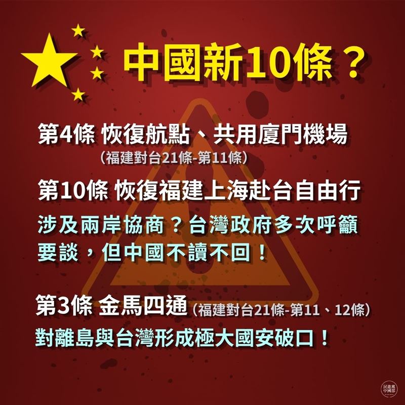 民進黨中國部揭露,所謂「新十條」,只是百條舊政策的回收再包裝。民進黨中國部盤點自2018年以來,中國已陸續推出「惠台31條」(2018)、「惠台26條」(2019)、「農林22條」(2021)、「福建對台21條」(2023)等措施,累積達到100條。此次「新十條」,不過是從既有政策中剪貼重組、再次包裝。所謂的「新」,其實正是表示過去這些「惠台」政策實際上很無感,或是根本口惠實不至。