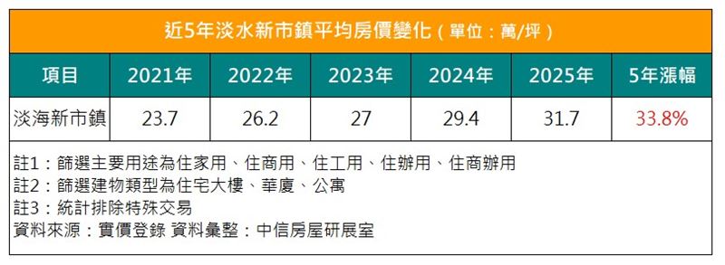 根據實價登錄統計,目前淡海新市鎮平均房價每坪31.7萬元,相較2021年23.7萬元漲勢亮眼。此外,2025年淡水區淨遷入人口達7996人,位居全國各行政區之冠,人口紅利強勁。
