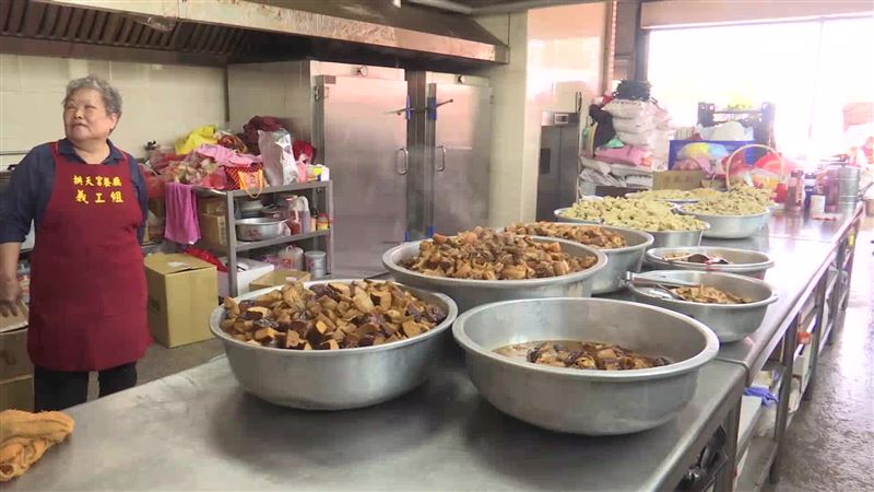 主廚陳春梅:「我在拱天宮已經做三十幾年了,老師傅傳給我的今年已經23年,我們的焢肉滷出去都是很多人跟不上我們的,(醬油)比較薄鹽,滷下來顏色也很漂亮,味道也很不錯。」