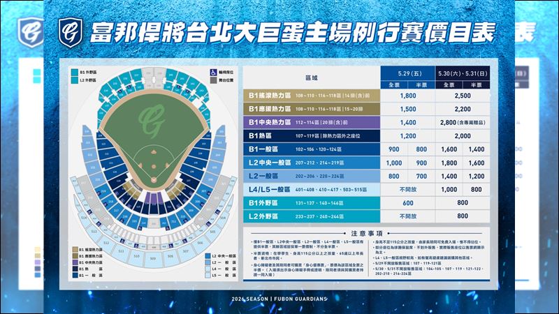 本次富邦悍將臺北大巨蛋主場賽事採取平、假日不同票價,憑悍將勇士聯名卡在富邦悍將售票網購買一般區門票,平日可享5折優惠(每場次限量900張)、假日9折優惠(每場次1250張),30、31日「G!POP流行音樂節」主題日座位全區開放,應援舞台前搖滾熱力區票價2500元、本壘後方中央熱力區票價2800元;外野B1、L2區皆為800元,相關進場贈品則將在日後陸續公布。