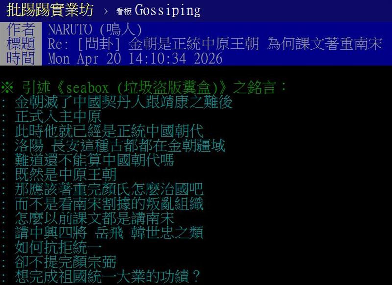 【網友質疑:金朝都入主中原了 為何不是主角】原PO在文中指出,金朝在滅掉遼朝與北宋後,已實質掌控中原,包含洛陽、長安等歷史核心地帶,「這樣還不能算中國正統王朝嗎?」他認為,既然金朝掌握中原政權,課本理應多著墨完顏氏如何治國,而非長期聚焦南宋「偏安江南」的抗金故事。