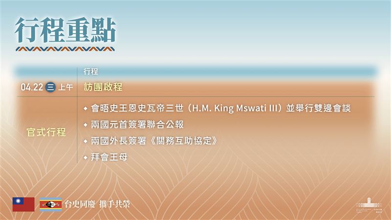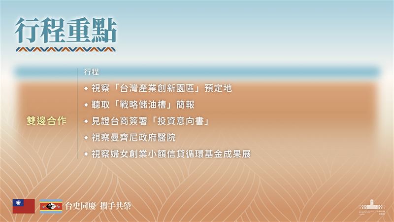 而在見證雙邊合作成果部分,賴清德也將視察「台灣產業創新園區」預定地、聽取「戰略儲油槽」簡報,並見證台商簽署投資意向書;同時視察駐史瓦帝尼醫療團「智慧醫療門診」、出席「婦女創業小額信貸循環基金」成果等活動。