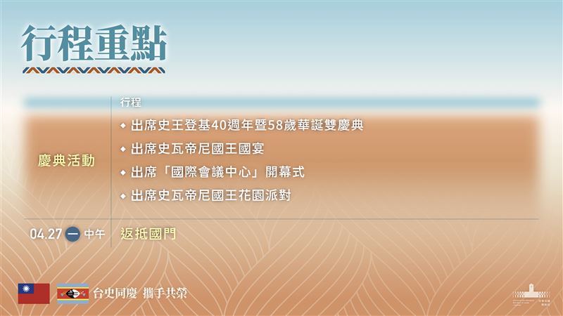 此外,賴清德此行也預計宴請史瓦帝尼及非洲南部地區僑胞,並於26日搭機返國前與隨團記者茶敘並受訪,預計於27日中午返抵國門並發表談話。