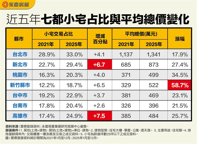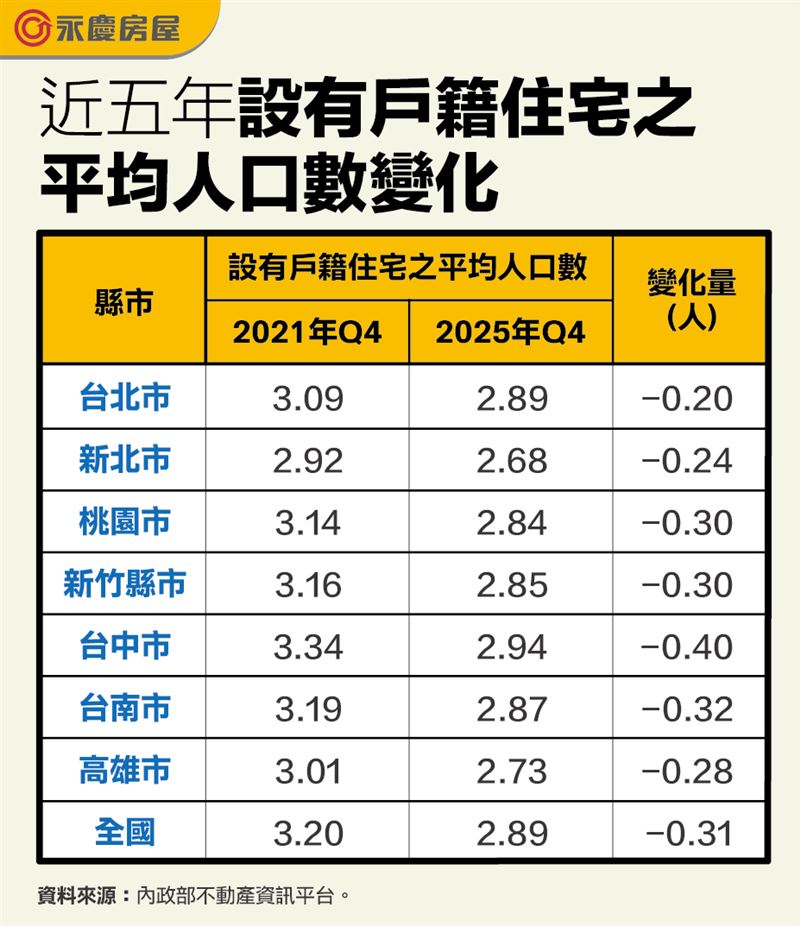 人口結構轉變正重塑房市地景。永慶房屋研展中心副理陳金萍指出,隨著少子化與晚婚現象普及,全台設籍住宅平均人口數已從2021年的3.20人,下降至2025年的2.89人,六都與新竹全面跌破3人大關。家庭組成走向小型化,加上房價高漲導致購屋預算受限,使得總價較低、門檻較易負擔的小坪數住宅產品,在近5年內獲得市場高度青睞,接受度明顯提升。