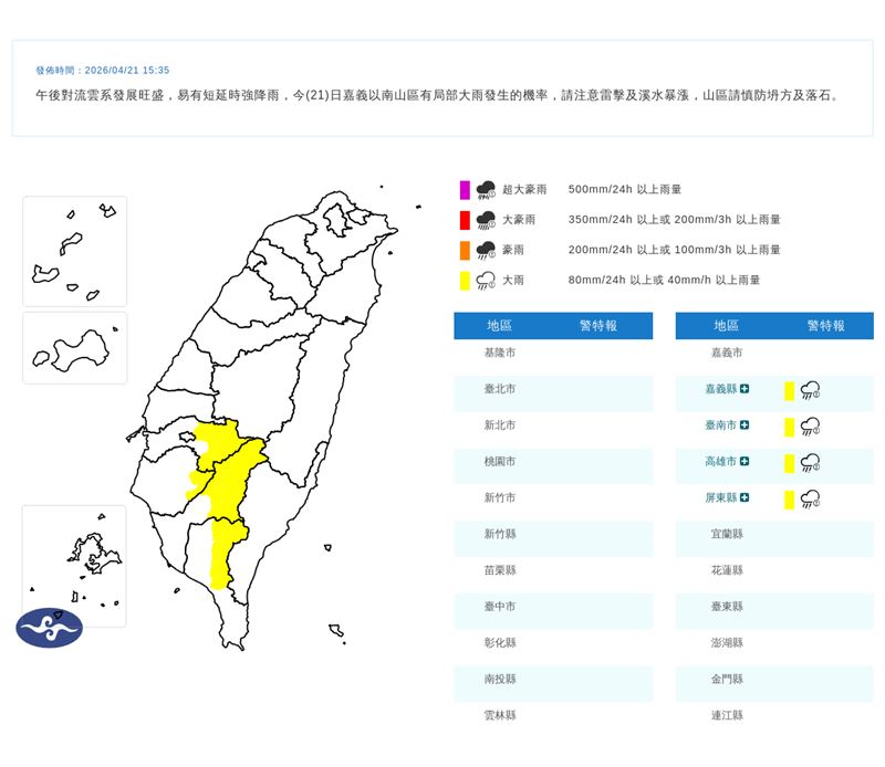 下班注意!由於午後對流雲系發展旺盛,易有短延時強降雨,中央氣象署針對4縣市發布大雨特報,將影響至今日深夜,提醒今(21)日15時35分嘉義以南山區有局部大雨發生的機率,請注意雷擊及溪水暴漲,山區請慎防坍方及落石。