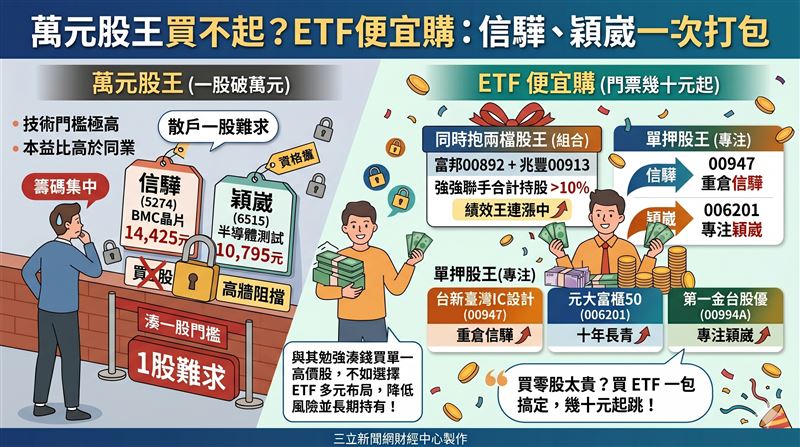 台股裡有兩檔股票,零股都要破萬元:IC設計廠信驊(5274)股價14,425元、半導體測試介面廠穎崴(6515)股價10,795元,對多數散戶來說,光是湊一股就已經是一道門檻。但市場早就給了另一條路:找對ETF,這兩檔萬元股王可以同時裝進去,而且門票只要幾十元起跳。