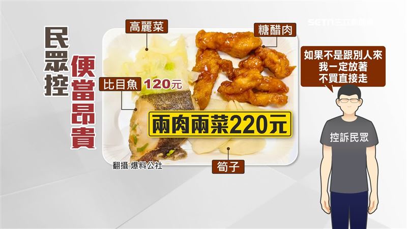 民眾分享,自己夾了高麗菜、筍子、糖醋肉,再加一塊比目魚單片120元,2肉2菜,總共220元,讓他忍不住發文抱怨,直說如果不是跟朋友一起來,早就放著不買直接走人。貼文曝光後立刻引發熱議,有人直呼太貴,根本是天價,也有人說光那塊比目魚尾段就要120元,就快一個比目魚便當價格。