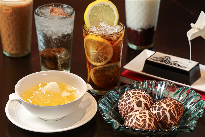 甜點部分主廚為迎接夏季推出青檸香茅凍,先將香茅熬煮出草本香氣,再拌入愛玉與檸檬汁一同凝製成果凍,最後加入檸檬冰沙增添口感,成品清爽滑嫩、酸香宜人。另一道蘑菇流沙包造型別緻又吸睛,柔軟富有彈性的麵皮搭配濃郁鹹甜的流沙蛋黃餡,驚喜又美味。充滿文藝氣息的墨戲仙草也是不容錯過,以故宮名畫《富春山居圖》為靈感,一口吃進名畫裡的山水詩意,瞬間沁涼消暑。