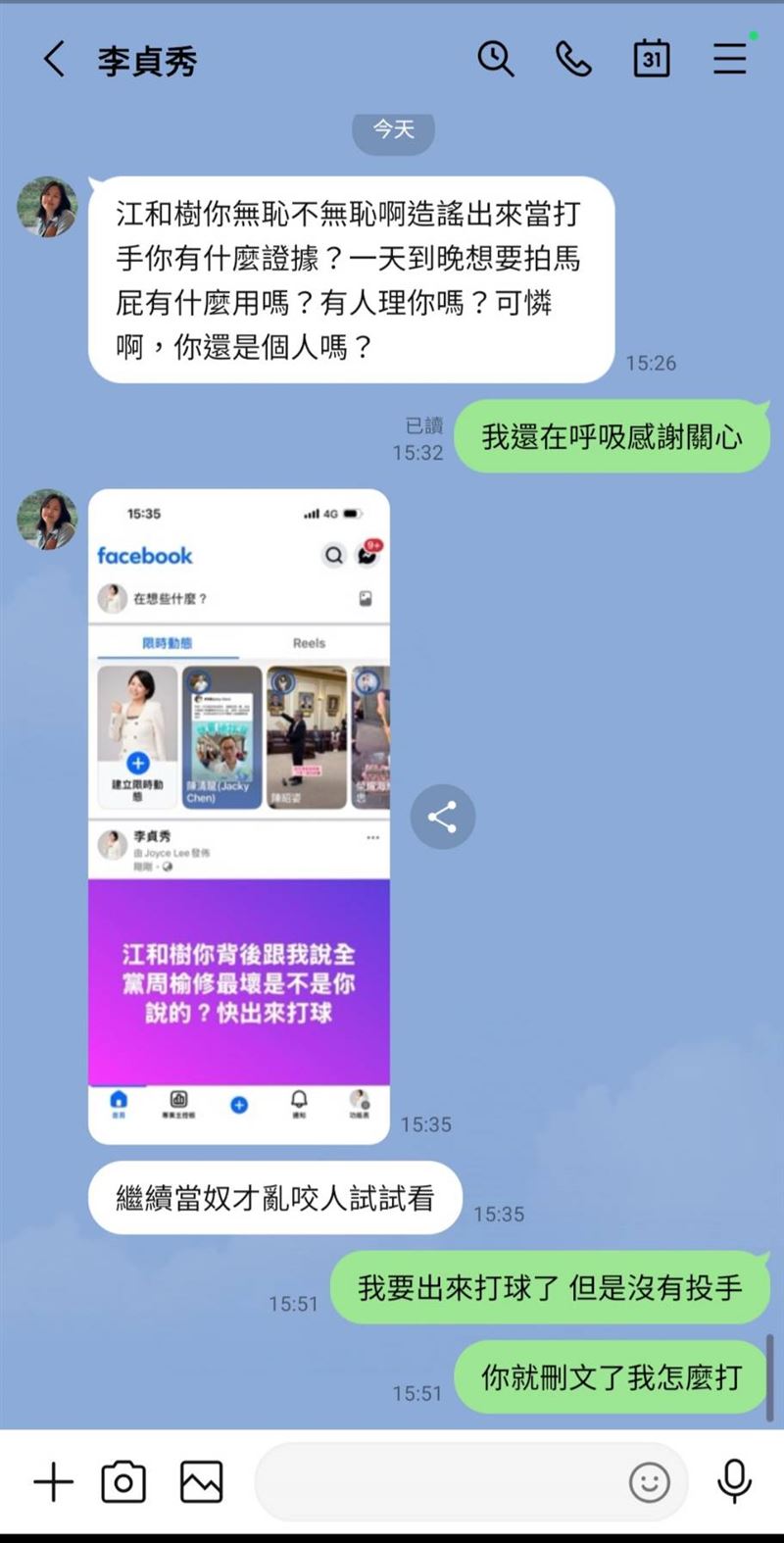 而江和樹則在媒體群組發出與李貞秀對話截圖,李貞秀在下午3時26分先說「江和樹你無恥不無恥啊造謠出來當打手你有什麼證據?一天到晚想要拍馬屁有什麼用嗎?有人理你嗎?可憐啊,你還是個人嗎?」江和樹則回「我還在呼吸感謝關心」;李貞秀則回傳一張自己臉書發文的截圖並嗆「繼續當奴才亂咬人試試看」,江和樹反擊「我要出來打球了,但是沒有投手,你就刪文了我怎麼打?」引發熱議。