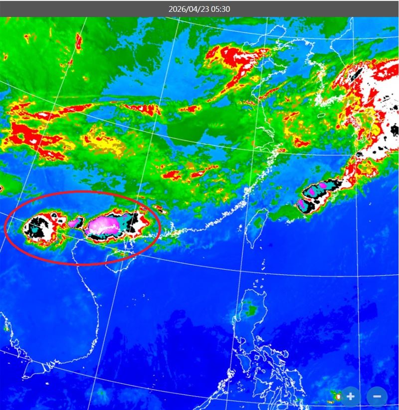 今(23)日清晨鋒面接近,中部以北及東北部有局部短暫陣雨,白天開始鋒面將由北往南逐漸通過台灣,天氣更為不穩定。前中央氣象局長鄭明典貼出一張衛星雲圖,並標出南海一帶的對流雲團,他表示,圈起來的地方持續有強對流發展,雲頂出現紫色區塊。