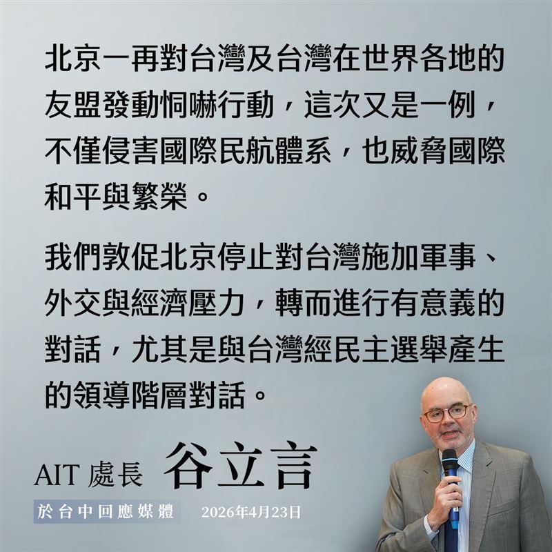 總統賴清德原定22日率團出訪非洲友邦史瓦帝尼,然而在出發前夕,非洲國家塞席爾、模里西斯、馬達加斯加在中國的經濟脅迫下,無預警撤銷專機飛航許可,經評估後決定暫緩出訪行程。對此,今(23)日美國AIT處長谷立言表示「北京一再對台灣及台灣在世界各地的友盟發動恫嚇行動,這次又是一例。」