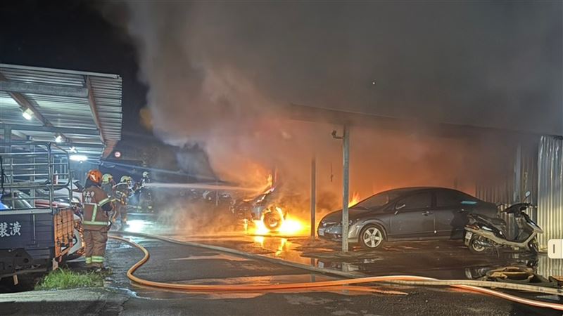 據了解,這個位於土城區延吉街111巷12弄內的室外停車場,在今天凌晨4時許,疑似停車場內堆放的物品或車輛不明原因起火,火勢迅速延燒至一旁停放的車輛及倉庫,新北市消防局獲報後,立即派遣大量人車到場搶救,消防隊到場後,現場多部車輛及倉庫已陷入火海。