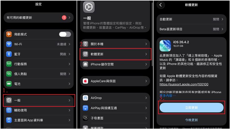 至於更新方式,用戶可進入iPhone「設定」中的「一般」> 「軟體更新」,下載並安裝 iOS 26.4.2。建議在Wi-Fi環境下進行,並確保裝置電量充足,以順利完成更新程序。