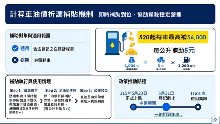 交通部說明,在計程車部分,補助對象為全國合法登記之計程車(不含純電動車)約9萬輛,每輛車最高補助6,000元,每公升折抵5元,並可一路使用至115年底,駕駛人於8月底前皆可提出申請。