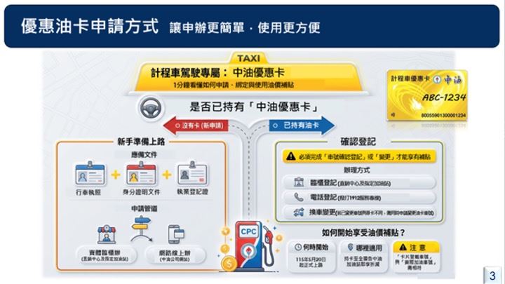 行政院表示,本案將由交通部統籌辦理,首波以中油公司為合作對象,符合資格之駕駛人可申辦「計程車優惠卡」或使用既有卡片登記,即可享有加油優惠。申請登記時間自115年5月20日起至8月31日,使用期限至115年12月31日,後續登記據點及作業細節將由主管機關另行公告。