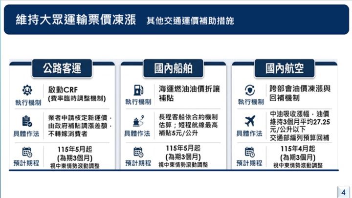 而在其他大眾運輸方面,行政院已指示維持國內陸海空運輸票價穩定,並採取差額補貼及油價折讓等方式,協助公路客運、國內船舶及航空業者因應油價波動。