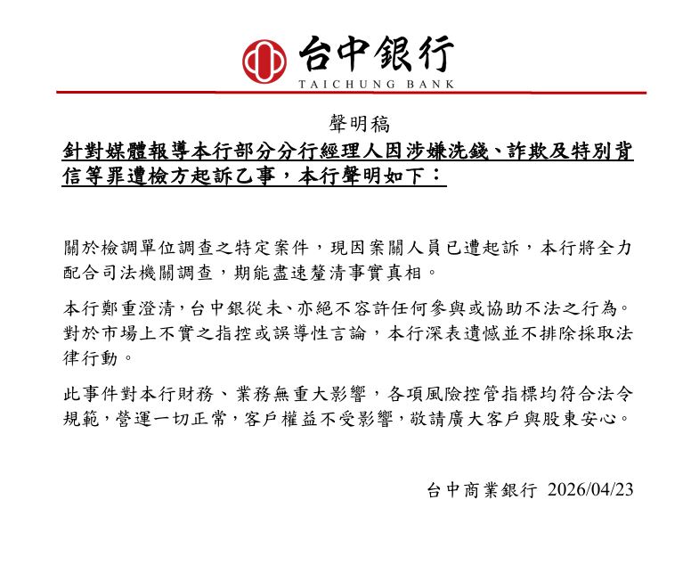 本行鄭重澄清,台中銀從未、亦絕不容許任何參與或協助不法之行為。對於市場上不實之指控或誤導性言論,本行深表遺憾並不排除採取法律行動。