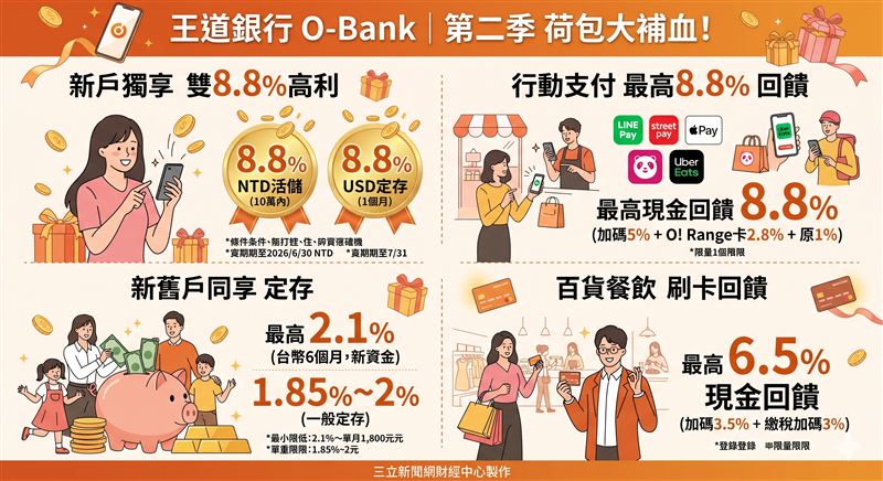 王道銀行(O-Bank)第二季優惠方案今日正式上線,從高利活儲、定存到刷卡回饋全面出擊。新開戶者最高可享台幣活儲年利率8.8%與美元定存年利率8.8%雙重好禮,搭配行動支付回饋加碼,現金回饋最高可疊加至8.8%;不限新舊戶的定存與刷卡優惠也同步啟動,百貨餐飲消費現金回饋加碼最高達6.5%,活動期間均至2026年6月30日止。