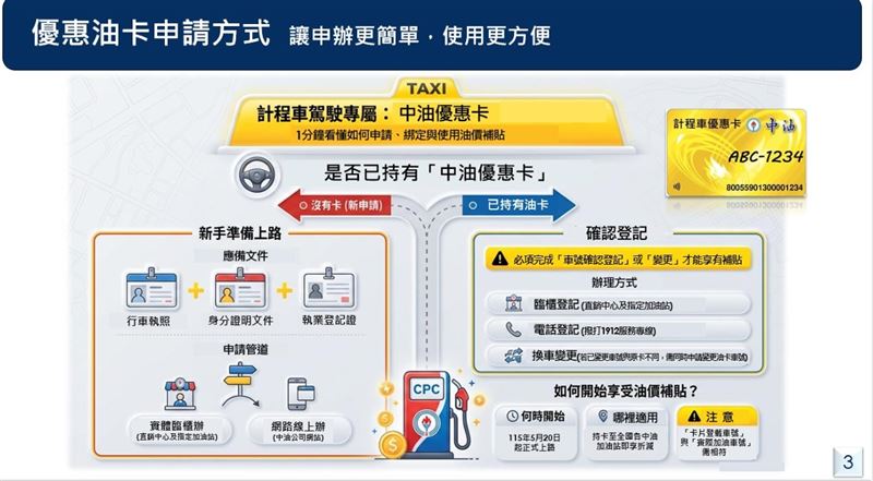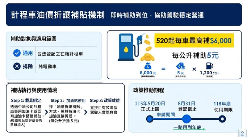 公共運輸監理司司長胡迪琦補充說明,此次政策主要因應國際戰爭情勢推升油價,自今年2月以來油價已上漲約5元,對計程車產業成本造成明顯壓力,因此依「民生安定、即時協助」兩大原則規劃油價折讓機制。補助對象為非純電計程車及多元計程車,採一次性加值6000元至中油優惠卡,駕駛持卡至中油加油站加油時,每公升可折抵5元;只要於8月31日前完成加值,即可使用至年底。