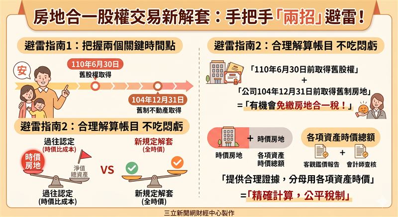 最新的避雷做法,是改採「兩階段判定」。第一步先看你賣的股權是什麼時候取得的。只要是110年6月30日以前就持有的「舊股權」,即使你在110年7月1日房地合一2.0實施後才賣掉,你都可以獲得解套。做法是去看公司帳上的房子是何時買的,如果是104年12月31日前就取得的「舊制不動產」,對應這部分的獲利,就可以不用課房地合一稅!