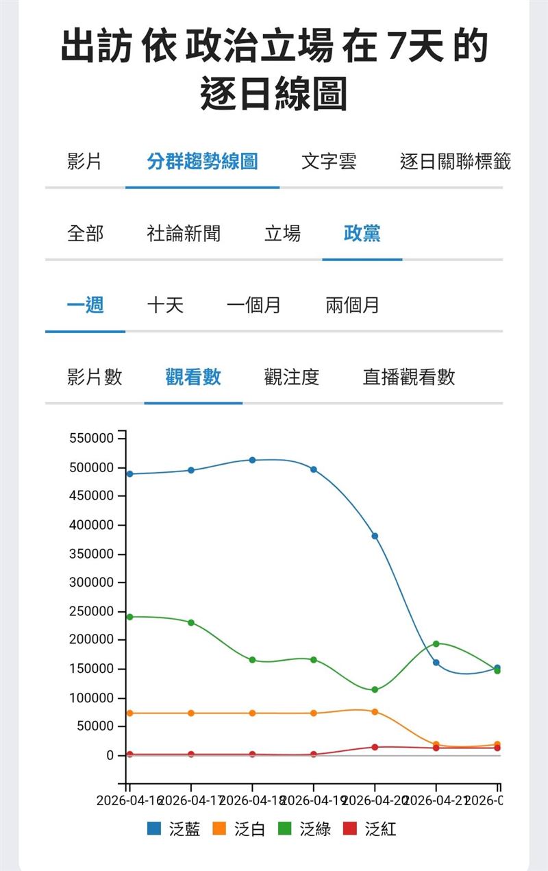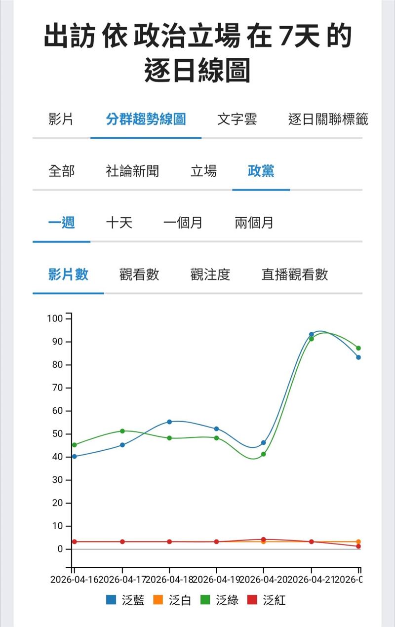 與泛綠相較,泛藍在第一張圖的一般影片數相當高,甚至一度衝到高點。但第二張圖卻顯示,泛藍的一般影片觀看數並沒有同步上升,反而在事件真正爆開後明顯下滑。「量大但效果弱化」的現象,正反映了泛藍在此次事件中最大的問題,論述分裂。