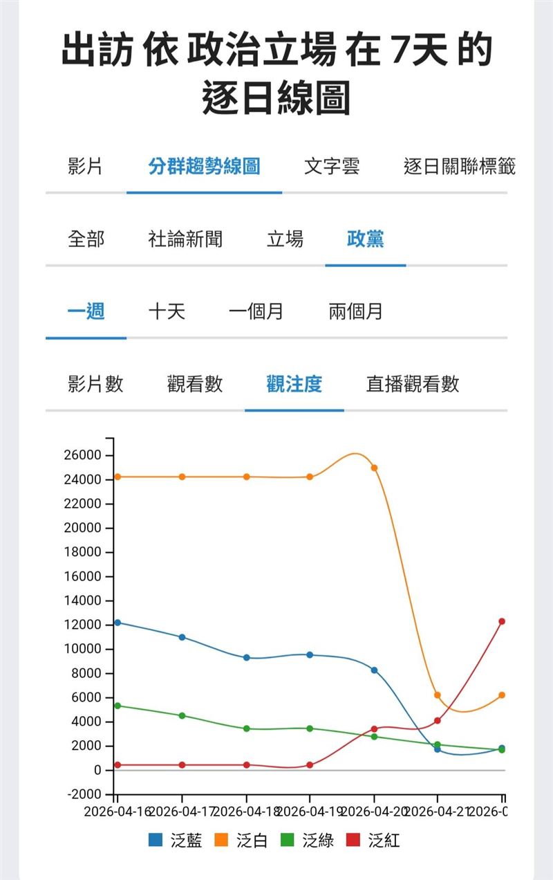 先看第一張圖,一般影片數在事件爆發後明顯上升,藍綠兩大陣營同步拉高。這代表「出訪受阻」已經不是單純外交問題,也進入了政論節目、自媒體與社群評論全面搶題的狀態。大家都知道這是一個能帶動情緒、立場與流量的超級大議題。