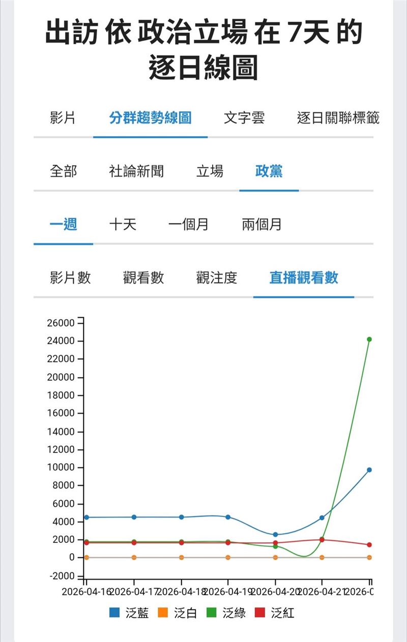 從第四張直播觀看數來看,泛綠在4月20日至22日之間出現非常明顯的爆發,最後衝到最高。這說明泛綠在這次事件中的真正強的,是直播式的即時動員。