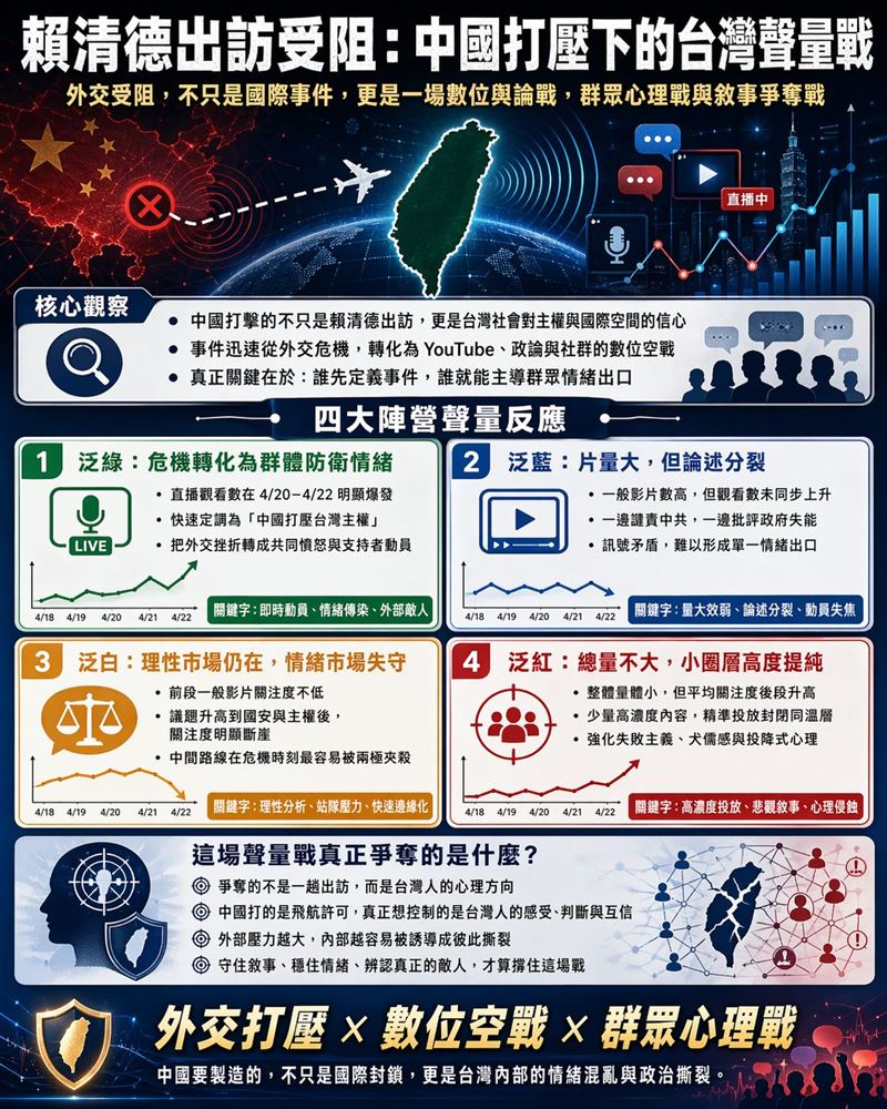 從政治傳播角度來看,這類事件最危險的地方,在於誰能最先定義事件框架。當「中國施壓非洲三國撤銷飛航許可」這個框架成立,事情的重點就在於台灣的主權受辱;但如果被改寫成「賴政府外交誤判、國安失能」,同一件事就從外部壓迫轉成內部究責。這也正是四張聲量圖揭露的核心,台灣各政治陣營面對同一場危機,搶奪的是不同的情緒出口。