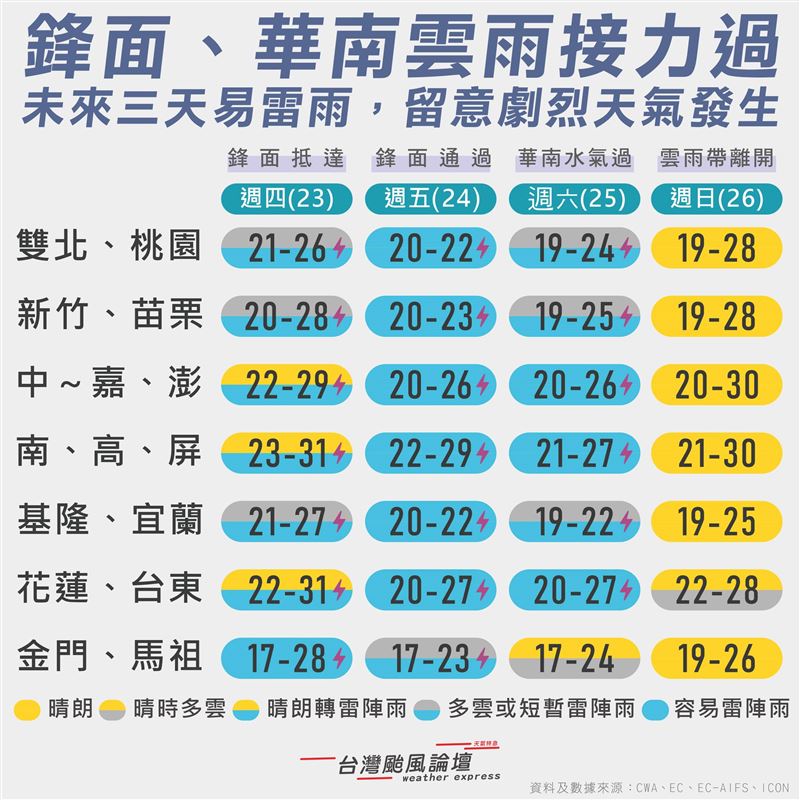今(23)日清晨鋒面接近,白天起將由北往南逐漸通過台灣。氣象粉專「台灣颱風論壇|天氣特急」表示,鋒面預計於上午抵達,北台灣首當其衝,率先出現雷陣雨,隨後雨區將逐步擴散;週六(25日)華南雲雨帶接力影響,各地仍多降雨。